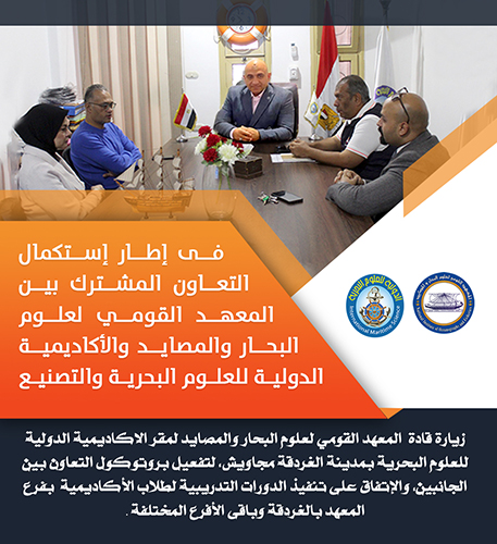 زيارة قادة المعهد القومي لعلوم البحار والمصايد لمقر الأكاديمية الدولية للعلوم البحرية بمدينة الغردقة –مجاويش، لتفعيل بروتوكول التعاون بين الجانبين، والإتفاق على تنفيذ الدورات التدريبية لطلاب الأكاديمية بفرع المعهد بالغردقة وباقى الأفرع المختلفة .